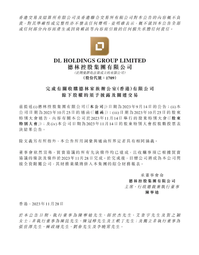 100%收购!德林控股完成对家族办公室全部股权并购