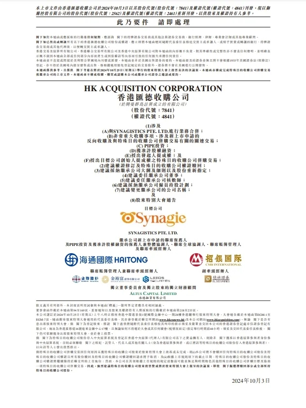 德林证券成功协助经办香港首宗De-SPAC交易:香港汇德并购Synagistics